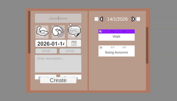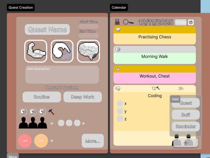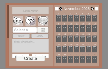 Additionally, an artefact is currently in development. The artefact is a gamified calendar that focuses on a weeks constrain, building routines, fighting bosses, etc. The artefact is being designed around a user interface design made in Figma, which I made to ensure a concrete design vision for the game.